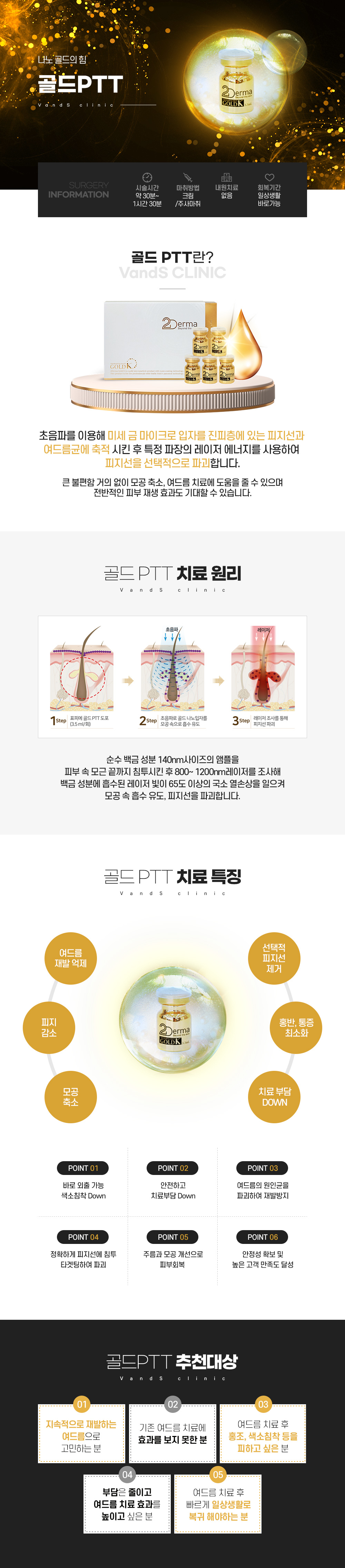 골드PTT는 골드 마이크로 입자를 초음파를 이용하여 모공 속으로 깊숙하게 침투시켜 이후 레이저를 조사했을 때 피부 전체적이 아닌 골드 마이크로 입자가 들어있는 모공에 반응하여 피지선에 선택적으로 영향을 주기 때문에 표피에 자극이 덜 한 장점이 있습니다.